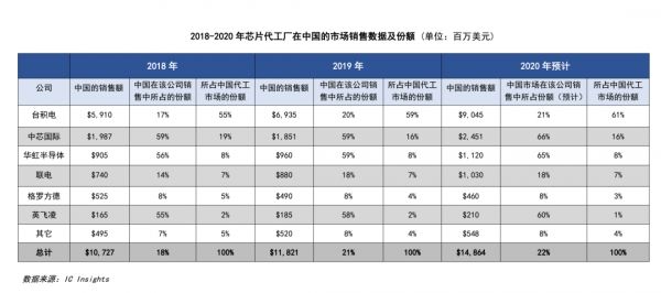 第三方数据公司IC Insights的数据显示,在中国的代工市场中,台积电仍占超过一半的市场份额,是排名第二的中芯国际市场份额的接近4倍左右。目前最高可量产到28nm工艺的华虹集团,2018年、2019年仅占中国市场的8%,且这个份额2020年预计不会发生变化。另外,中芯国际和华虹集团超过一半的销售额都是中国市场贡献的。