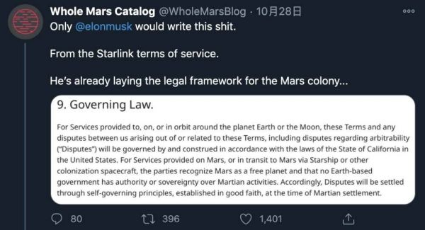 这次,马斯克通过这样一个为Starlink的测试用户提供服务的机会,暗戳戳地抛出这样一条“火星自治”的条款,实在是一个非常高明的策略。毕竟现在离着真正为火星用户提供星链的网络服务还差着很长的时间,他可以先来测试下他的忠实用户的选择,也能试探下美国政府对这一主张的态度,还不用承担任何的法律风险。