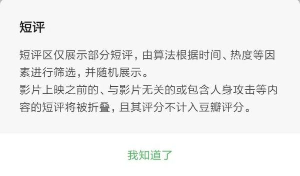 豆瓣APP给出的短评规则是短评区仅显示部分短评,由算法根据时间、热度等因素进行筛选,并随机展示。影片上映之前的、与影片无关的或包含人身攻击等内容的短评将被折叠,且其评分不计入豆瓣评分。