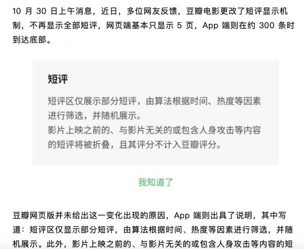 10月30日,《新浪科技》一记洛阳铲挖出了豆瓣电影短评机制的坟。其在《豆瓣电影更改短评显示机制:算法筛选,仅展示部分短评》一文中指出,豆瓣电影更改了短评显示机制,不再显示全部短评。