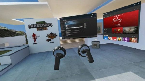 在 Windows Mixed Reality 中的桌面控件,图中 Steam 窗口中的进度条在 VR 中几乎看不见了,同时用户需要用控制器上的细细的激光去“瞄准”进度条才能使用。