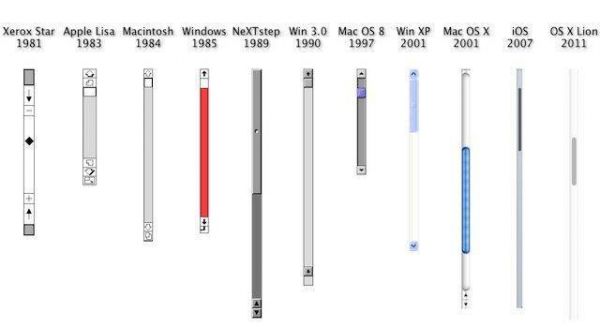 现有的2D界面,是根据已有的输入媒介(我们甚至可以把鼠标理解为现实世界中的『追踪设备』)而设计的,而不是将『过去』的一套界面应用到现在的新介质里。比如我们拥有了带滚轮的鼠标,以及鼠标的一系列点击/拖拽的操作,同时我们有了阅读长页面的需求,那么在浏览器中使用 Scroll Bar 滚动条来表示页面位置信息以及控制页面滚动,就是一个很直观的设计。