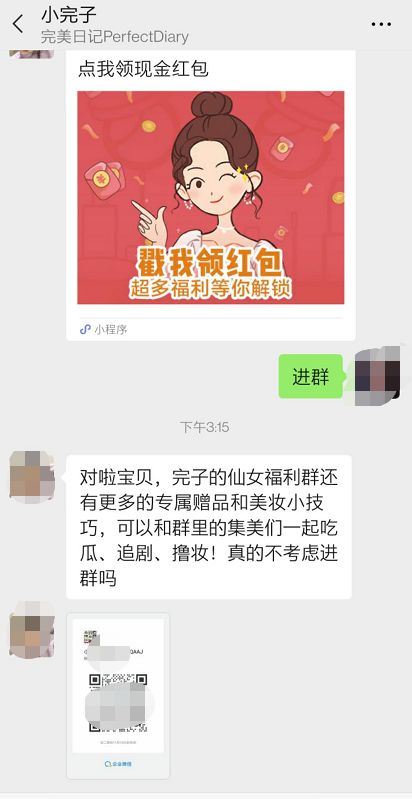 另一方面,完美日记官方运营的公号近70个,包括完美日记研究所、完美日记实验室等等,这些公众号均有微商城功能。同时,还通过客服小完子拉拢顾客进入微信群,在引导消费者进入微信群之后,美妆顾问小完子、小美子会维护群内消费者,通过发一些美妆教程、优惠信息等来形成与消费者的黏性。