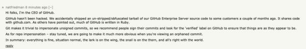 随后,Nat Friedman 迅速在 Hackernews 的帖子上做了回复。他表示 GitHub 没有被黑客入侵,一切都很正常。所谓泄露的代码是几个月前他们意外地将 GitHub Enterprise Server 源代码未脱敏 / 混淆的 tarball 交付给了一些客户。