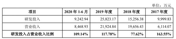 招股书显示,云知声累计研发投入占累积营业收入的比重为107.4%,研发费用投入占比高于同行业水平,研发费用规模增长较快。