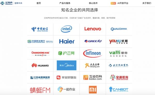 在云知声官网“合作伙伴”一栏,诸如中国电信、英特尔、联想、高通等知名互联网和服务器厂商赫然在列。官网显示,云知声目前的合作伙伴已经超过2万家,覆盖互联网、移动互联网、智能家电、车载系统、在线教育、智能客服、智能芯片等领域。
