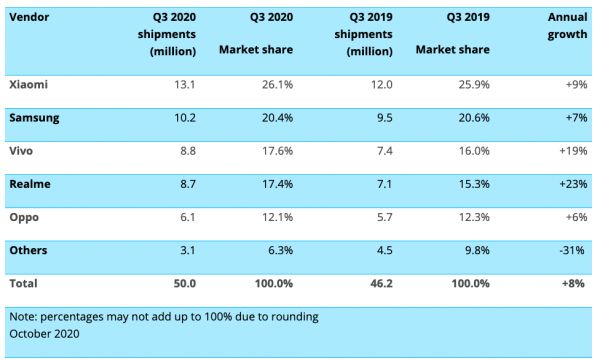 这5000万部手机中,来自中国的手机品牌仍牢牢占据着70%以上的市场份额。Canalys的数据显示,小米仍然是市场领头羊,增长9%,出货量为1310万部。 三星从vivo手中夺回第二名的位置,销量为1020万部,增长7%。三星在低端市场积极进取的产品组合和定价策略获得了回报。vivo位居第三,出货量增长19%,达到880万部,而Realme则以870万部的出货量紧随其后。OPPO出货量为610万部,跻身第五名。