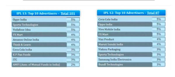 2019年、2020年印度板球超级联赛赞助商广告声量排名|TAM Sports