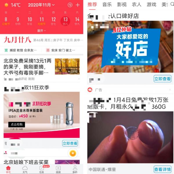 首页主要以资讯为主,资讯内容为头条号提供,资讯分类基本按照今日头条App的分类排列和收集。日历功能则在首页的顶部,用户可以看到公历、黄历的日期显示,还可以查询当日的宜和忌。另外用户还可以点击首页右上角的“加号”,新建日程提醒。
