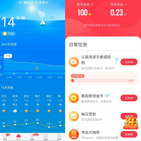 除了以上常规的功能外,该App最吸引人的功能当属任务功能,这也是近期该App增加的一个新功能,用户可以通过做日常任务,比如阅读文章或视频即可获取金币(App内的虚拟货币),积累的金币会在每日凌晨按照一定的比例兑换成现金,现金积累到一定金额后即可提现到个人的支付宝,目前最低的提现金额为0.5元。这样的做法大大提升了用户在App内的停留时长。