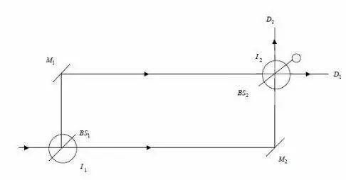 第一步:我们拿一块经过半镀银处理的反射镜BS1来代替双缝实验中的挡板。根据量子的分布随机性,从图示左侧射入的单个光子有一半可能通过反射镜,一半可能会被反射。如果我们把光子的入射角度设置为45度角,则一个光子可能会直飞(I1→M2),可能会被反射成直角(I1→M1)。