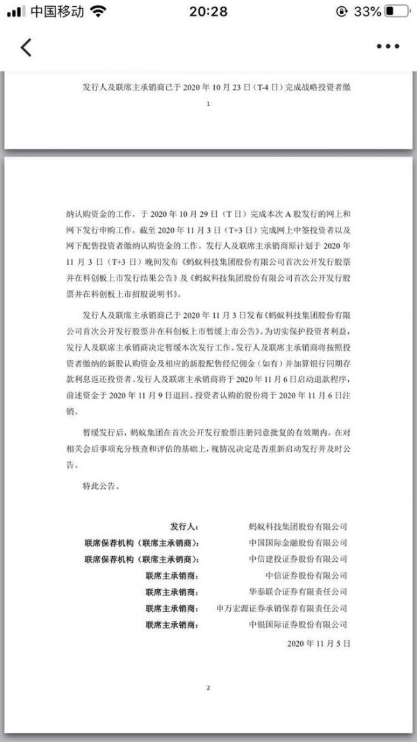 今日,蚂蚁集团发布公告,公告显示,发行人及联席主承销商将于2020年11月6日启动退款程序,前述资金于2020年11月9日退回。投资者认购的股份将于2020年11月6日注销。
