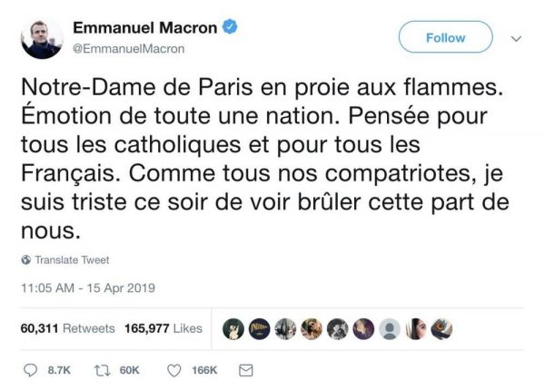 法国总统马克龙在推特表示:圣母院的火焰吞噬了巴黎,而悲痛的情绪席卷整个法国,此次此刻我感到很痛心,我们每个人内心都有一小部分被大火烧掉了。