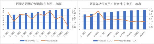 阿里巴巴月活用户新增情况,阿里年活买家新增情况,数据来自财报,制图:36氪