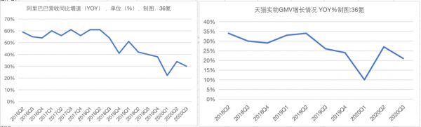 阿里巴巴营收同比增速、天猫实物GMV同比增长情况,数据来自财报,制图:36氪
