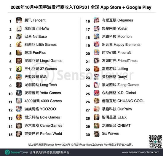 新浪科技讯 11月6日上午消息,Sensor Tower商店情报平台显示,2020年10月中国手游发行商在全球 App Store 和 Google Play 的收入排名。榜单中30个手游发行商10月全球吸金21亿美元,环比增长9%,占当期全球手游总收入30.5%。