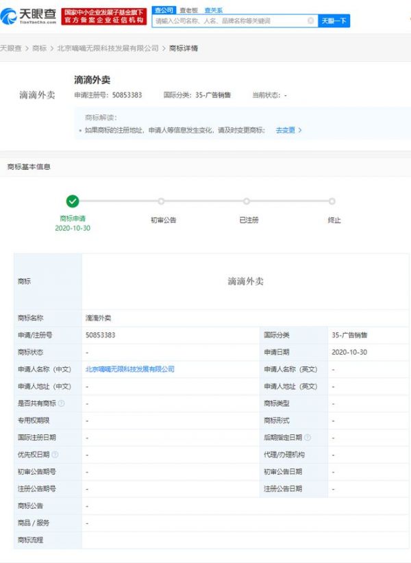 天眼查App显示,近日,北京嘀嘀无限科技发展有限公司新增一条商标信息。商标名称为“滴滴外卖”,申请日期为2020年10月30日,国际分类为广告销售,商标状态显示为“商标申请中”。