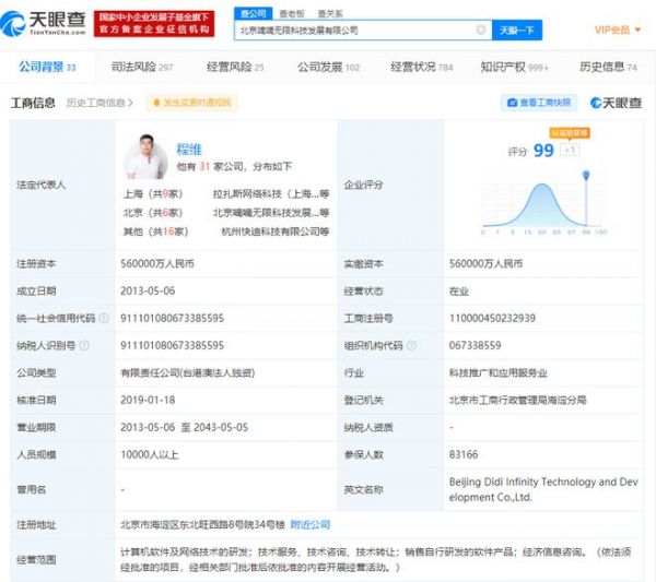 北京嘀嘀无限科技发展有限公司成立于2013年5月,注册资本56亿人民币,法定代表人为程维,经营范围包括计算机软件及网络技术的研发;技术服务、技术咨询、技术转让;销售自行研发的软件产品;经济信息咨询,由小桔科技香港有限公司全资控股。