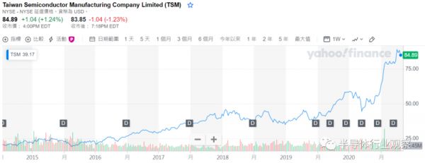 2015年台积电凭借自家的InFO封装技术脱颖而出,独揽苹果手机处理器订单直到2020年。在先进工艺制程和先进封装的驱动下,台积电这些年在代工界叱咤风云。2015年10月台积电的股价大约在21美元,而来到5年后,台积电的股价最高达到88美元,近5年涨幅为319%。