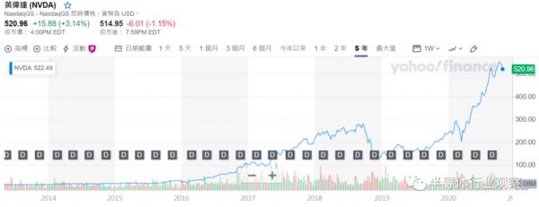 英伟达在过去的五年中,受益于游戏和数据中心行业的迅猛发展,已成为股票市场的明星。仅今年,NVIDIA股票就上涨了近134%。而回看近5年,英伟达的股价从5年前的20美元至30美元的范围上涨到如今的550美元。近5年涨幅为1796%(参考2015年10月26的股价29美元)。