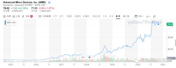 涨幅最大的当属AMD。2015年10月,AMD艰难地维持在每股2美元的水平,而在当时随着个人电脑业务的下滑,它似乎没有存在的理由。但经过长期的运营奋斗,AMD终于在其出色的领导团队的领导下,在经济价值创造方面走出了困境。如今AMD股价已经一路高歌猛进飙升到85美元左右,近5年AMD股价翻了40倍,涨幅4150%。