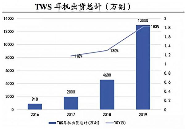 两大代工厂业绩上涨的背后,是TWS耳机需求量的暴增。市场调研机构Counterpoint数据显示,2019年,全球TWS耳机的规模为1.2亿部,预计2020年,TWS耳机的市场规模将达2.3亿部。