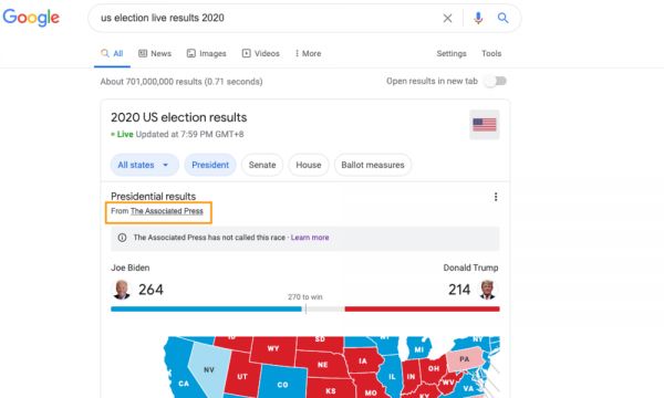 不只是谷歌搜索,美国主流新闻媒体,比如全国公共广播电台(NPR)、公共电视网 (PBS)、《纽约时报》《华尔街日报》《华盛顿邮报》,还有YouTube以及世界其他媒体机构,都翘首以盼,等待美联社发布最终的大选结果。