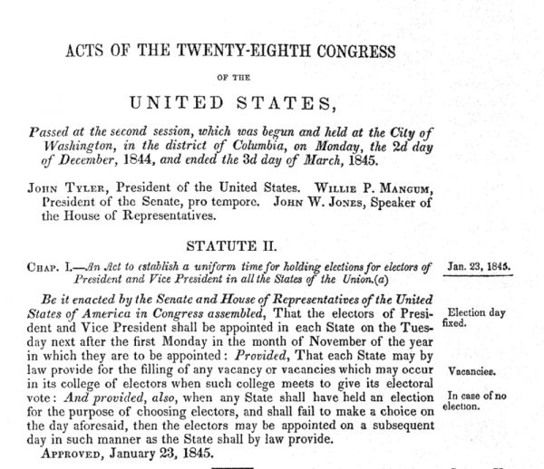 然而到了1845年,国会担心这种做法会让较早投票的州影响其他州的选举。因此,国会通过立法将11月第一个星期一后的第一个星期二(注意,不是11月的第一个星期二)定为全国统一的选举日。