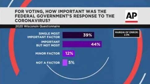 AP VoteCast对康斯威星州的3000多名选民进行调查,询问对联邦政府处理新冠疫情的举措是否会影响投票。超过80%的人说这是一个重要因素,而39%的人说这是最重要的因素。这个调查结果或许可以解释作为关键摇摆州的康斯威星州为什么最终“翻蓝”。