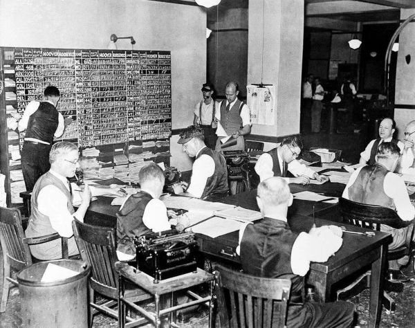 1932年11月8日的选举日,在华盛顿分社,没有计算机系统时只能人工统计。