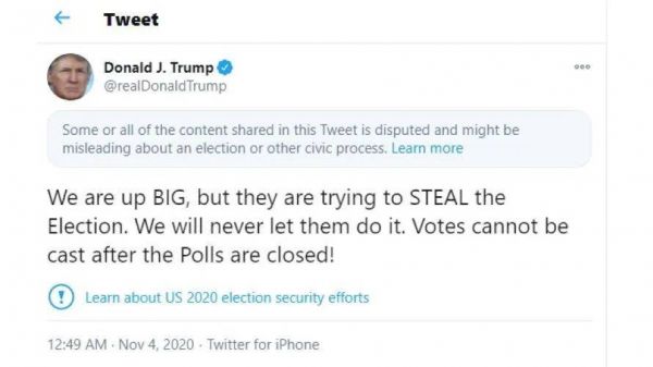 11月4日,川普在推特表示:“选举日之后不能计算新的选票”。