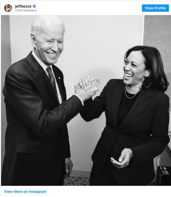 有趣的是,全球首富亚马逊CEO贝索斯得知拜登胜利之后立即上传了拜登和哈里斯的照片,表达了自己的欣喜之情,强调“团结、同理和体面”的时代又回来了。由于他旗下《华盛顿邮报》的舆论抨击,贝索斯成为了特朗普最痛恨的科技超级富豪,过去几年只能默默忍受着美国总统的各种炮轰。拜登当选,意味着贝索斯持续四年的阴影终于结束了。
