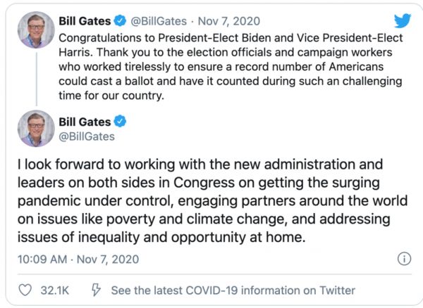 在拜登当选之后,硅谷旧金山、圣何塞和山景城等地街头一片欢腾。各大企业CEO以及盖茨这样的精神领袖都迫不及待表达了祝贺之情。微软总裁史密斯、Facebook COO桑德伯格、思科CEO罗宾斯先后表示,美国朝着多元化、包容迈出了重要一步。盖茨公开表示期待与新政府合作共同遏制美国已经失控的疫情。由于此前不断批评美国政府的新冠疫情工作,盖茨甚至成为了保守派最痛恨的人以及阴谋论中企图毁灭世界的邪恶富豪。