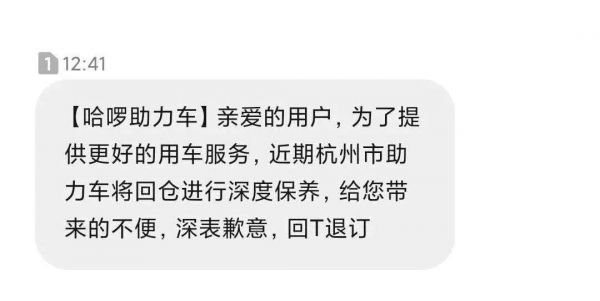 后来他收到的短信,解释了这个问题。一条来自哈啰的短信显示,“为了提升服务质量,对杭州市内的助力车进行回仓保养”。