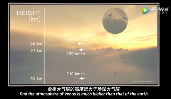尽管地表条件恶劣,我们认为金星云层的条件也许会好一点,那里更凉爽且更潮湿,可以达到20摄氏度左右,气压与地球表面气压接近。这是目前金星云层的图表,金星大气层的高度远大于地球大气层,高度大概在50千米~60千米,人类打算在未来把重量很轻的气球发射到金星的云层中,通过现代信息与科技开展更多的观测。