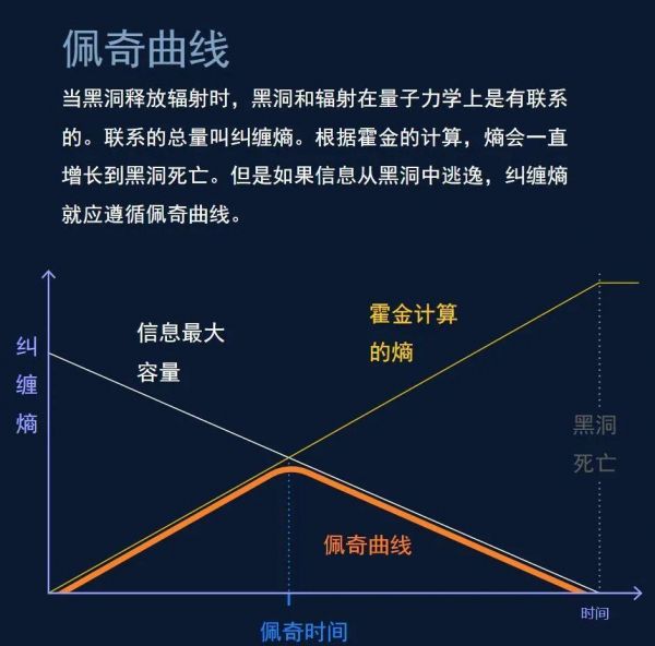 佩奇计算了黑洞和辐射之间的纠缠总量,这个总量被称为纠缠熵(entanglement entropy)。开始还没有辐射时,纠缠熵为零。结束时没有黑洞,纠缠熵也为零。在中间过程伴随辐射过程,会产生纠缠熵。总体而言纠缠熵应该像一个倒V字。