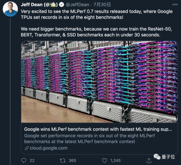 很高兴看到MLPerf 0.7的结果,谷歌TPU在八项基准测试中,创造了六项纪录。