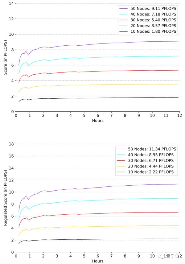 下图展示了用不同规模的机器进行评估的“基准分数”和“规范分数”(单位均为FLOPS),随时间产生的变化。