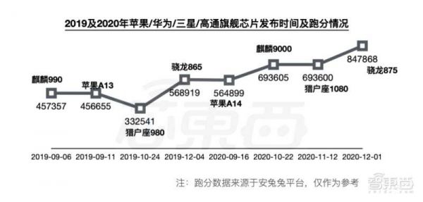 为保证客观,芯东西还搜集跑分平台安兔兔透露的苹果、华为、三星、高通5nm芯片跑分情况,并与四家公司7nm芯片跑分对比,制图表如下: