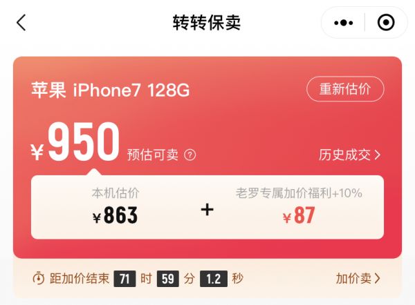 虽然转转给出的预估价最高,但950元是本机预估价加上平台补贴后的价格。