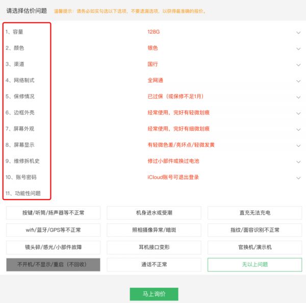 在预估价的估价标准上,相较于其他两个平台,转转只有版本、容量、保修期和预估机况4项标准,在标准设定上较为粗。