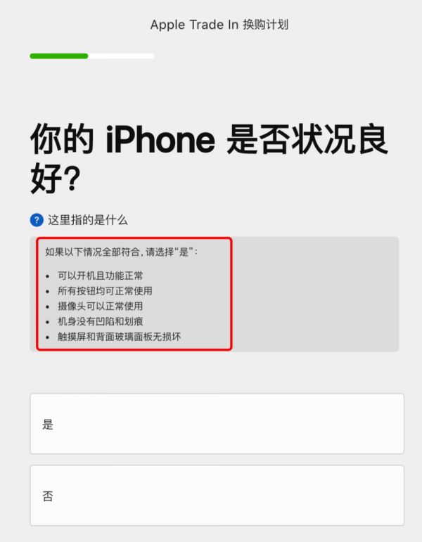 以苹果官网为例,选择好想要购买的新手机后,会出现“你是否有智能手机要折抵”的选项,根据提示输入旧手机的情况,在关于“iPhone 是否状况良好”一栏中,页面上显示出可以开机且功能正常、所有按钮均可正常使用、摄像头可以正常使用、机身没有凹陷和划痕、触摸屏和背面玻璃面板无损坏等说明。