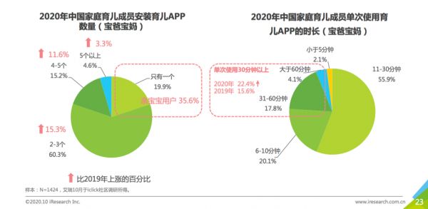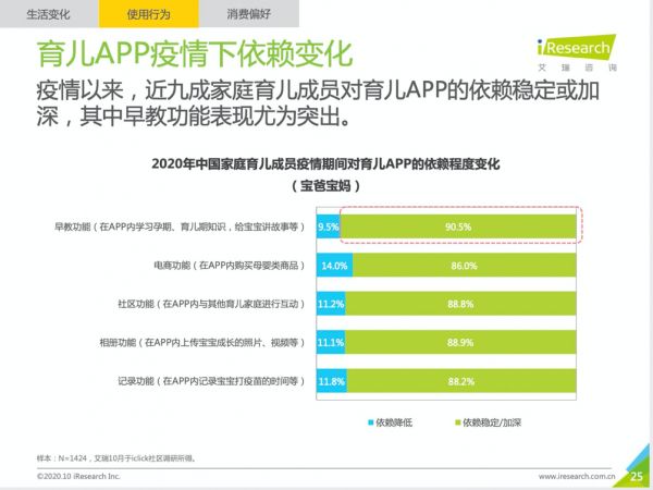 尤其在疫情之下,90.5%的宝妈宝爸对育儿APP的早教功能依赖稳定或者加深,安装数量和使用时长也在提高。