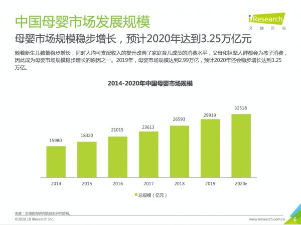 这直接给母婴市场,或者说育儿行业带来了结构性机会。艾瑞最近出炉的《2020年中国育儿家庭发展趋势报告》(以下简称艾瑞报告)指出,母婴市场规模在2020年将达到3.25万亿元。
