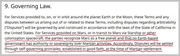 后半段谷歌翻译为:对于在火星上提供的服务,或通过星际飞船或其他殖民化航天器向火星提供的服务,当事方承认火星为自由星球,并且没有任何地球上的政府对火星活动具有权威或主权。因此,争端将通过在火星人解决之时真诚建立的自治原则解决。