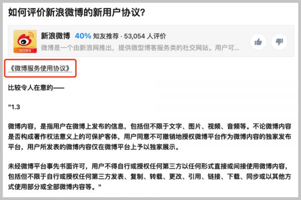 几年前,新浪微博因一次服务使用协议更新事件,遭到大家口诛笔伐。协议中,微博要求用户“同意不可撤销地授权微博平台作为微博内容的独家发布平台,用户所发表的微博内容仅在微博平台上予以独家展示”“不得自行或授权任何第三方以任何形式直接或间接使用微博内容”。