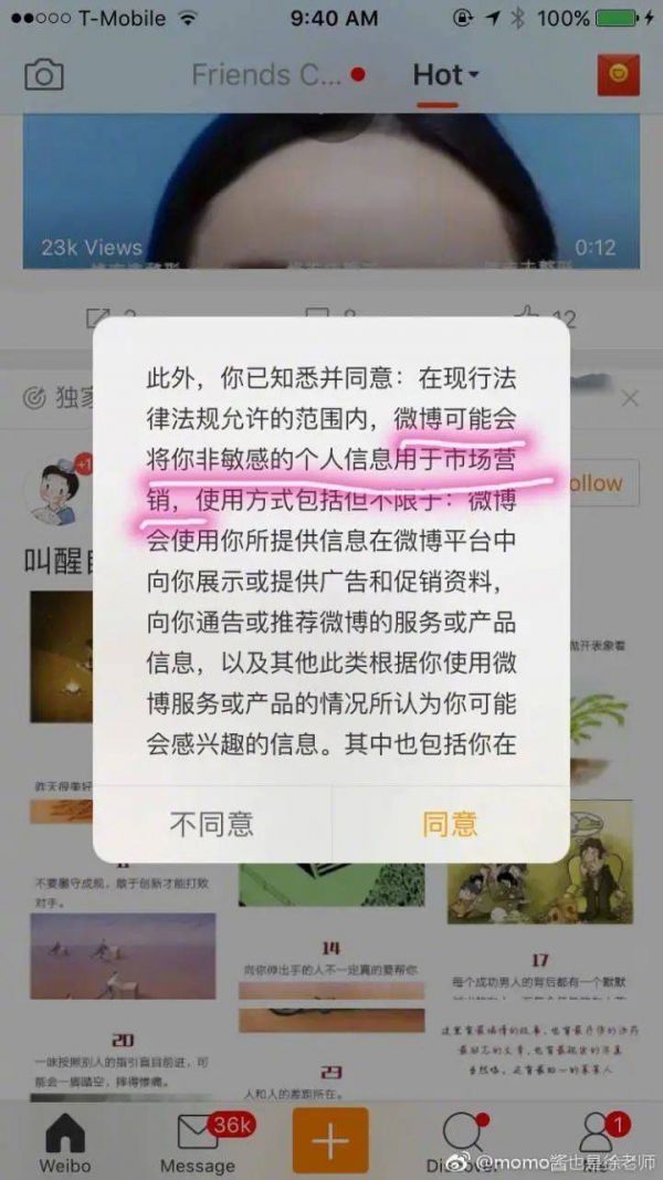 为了正常使用微博,大量用户不得不同意条款,比起和大多人普通用户无关的内容版权归属问题,隐私问题更受大家关注,但也仅停留在“关注”这个层面上。