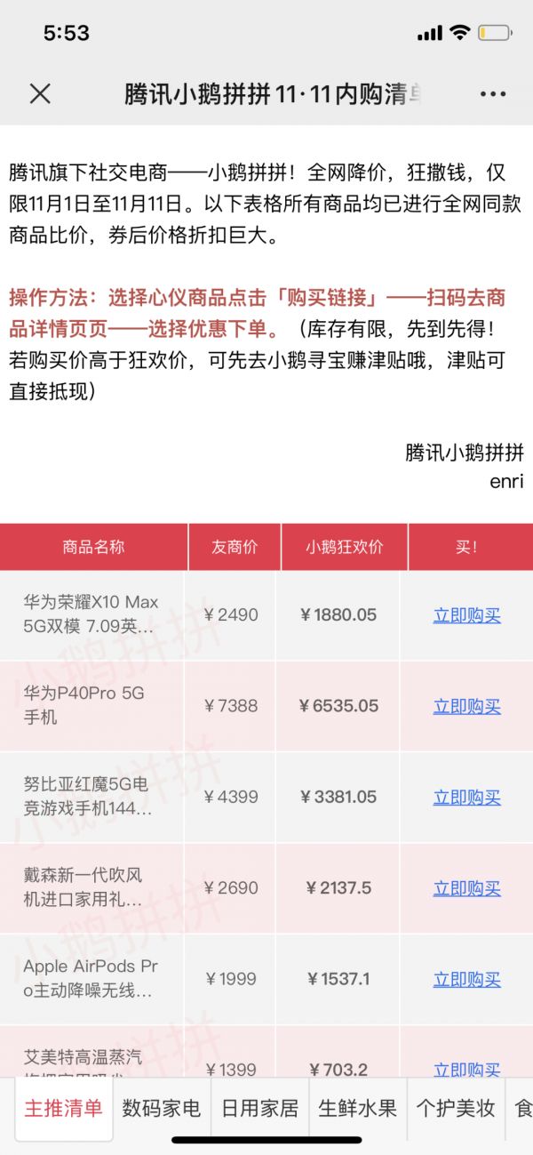 同时,「小鹅拼拼」为每个热销商品都附带了商品链接,用户想要下单时,一键即可购买。用大差价作为驱动力,促使用户购买,并尽可能的减少用户的购买链路,同时表格的便利性也能让用户不必再四处比价,直接分享给朋友。