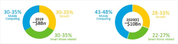此前,联发科进行了架构的重整,分为无线通信、智能设备、智能家居三大板块。从具体营收来看,由于5G手机出货量尚处于增长期,本季度联发科“智能手机与平板”业务的营收占比有所增加,从去年的30%35%增长到了43%-48%。联发科预估,2021年5G手机将会有一倍以上的年增长率。