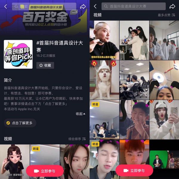 另一方面,平台方愈加重视这一群体,针对特效师推出了多个扶持政策。比如,为了选拔优质的特效师,在首届抖音道具设计大赛中设置高额现金奖励,获得大师奖和人气奖的特效师均可获得10万元。截至发稿前,该话题播放量达15.2亿。